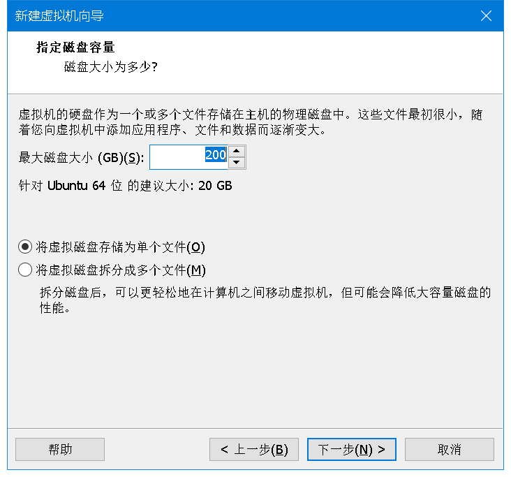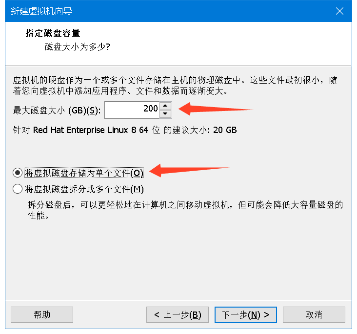 不拆分虚拟磁盘文件,选择“将虚拟磁盘存储为单个文件”