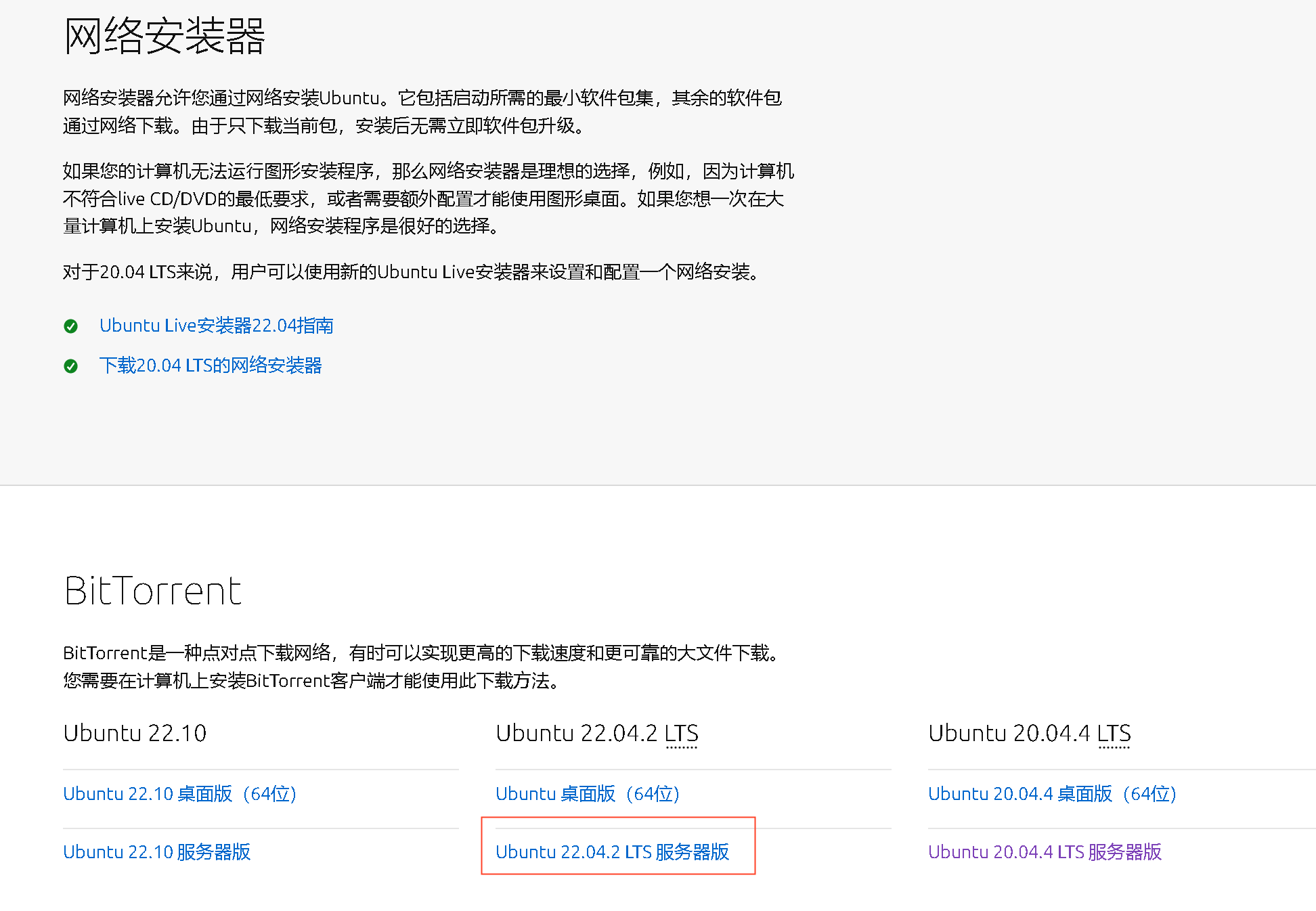 1.打开以上官网下载链接,找到22.04.2 LTS服务器版,点击后会下载ubuntu-22.04.2-live-server-amd64.iso.torrent文件,文件很小,下载后再使用torrent下载工具打开这个文件,下载正式的镜像文件