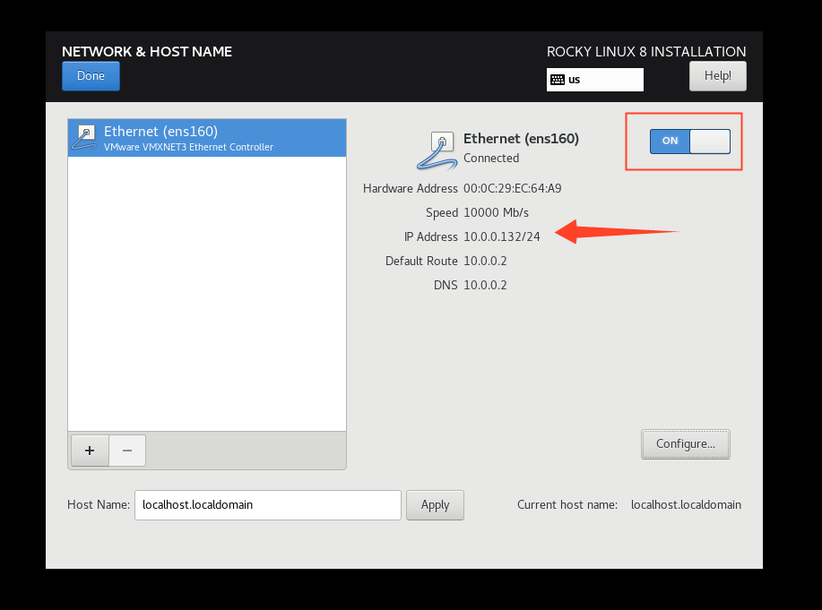 16.配置网络,选择网卡为“on”状态,如果已经在虚拟交换机中已经配置过vmnet8的DHCP功能,那么会自动获取一个IPv4的地址