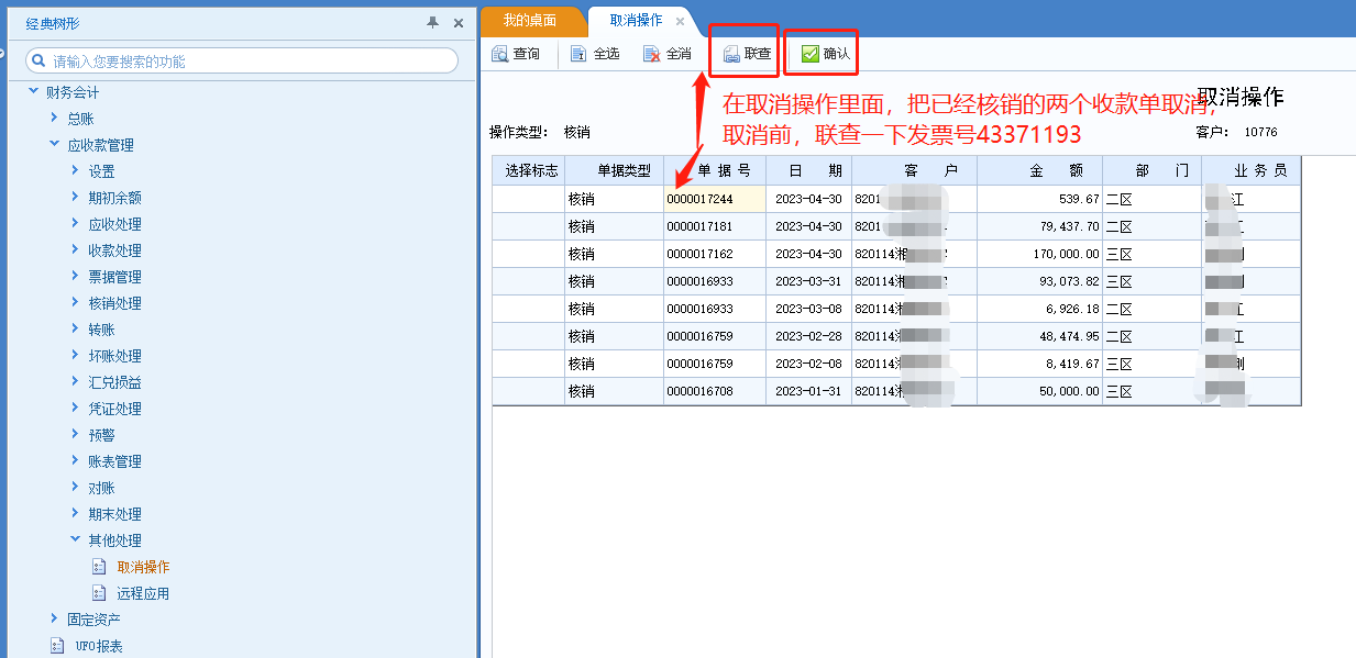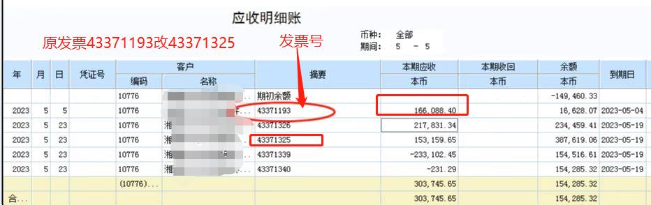 原发票号43371193,修改后作废,发票号改为43371325(和纸质对应),应收款却没有消掉。