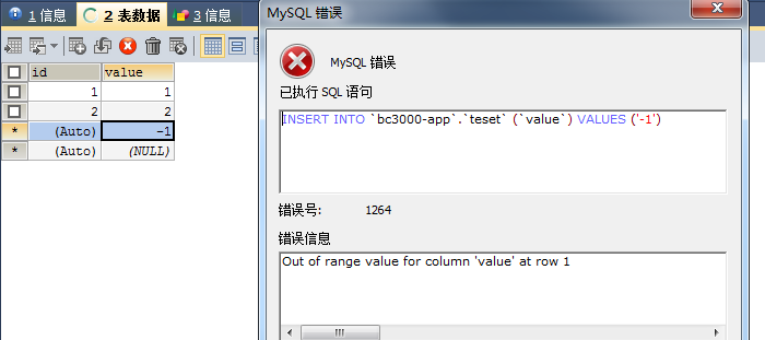 2,Unsign代表无符号位,表示只能存放正数。插入负数会报错
