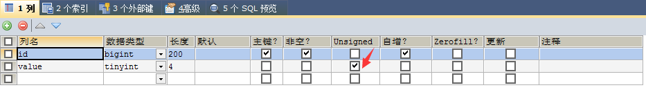 比如我建表时,Unsigned这一列没有勾选(使用Signed),表示这一列存储的值是有符号的。既能存放整数,又能存放负数