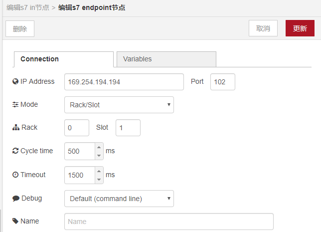 IP Address处填写PLC的IP地址,Port默认为102,Mode选为Rack/Slot,PLC默认的机架号为0,插槽号为1;