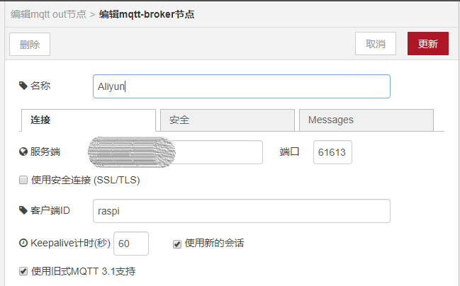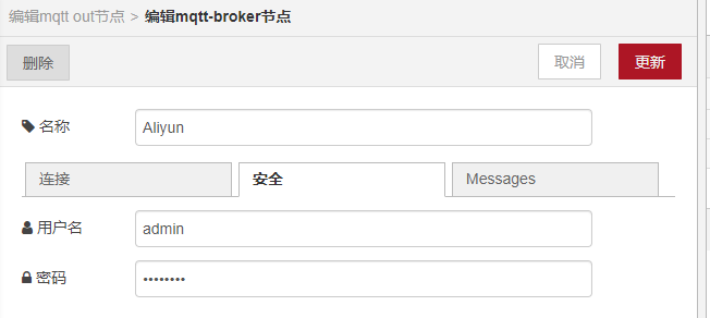 上图中,服务端的IP填写阿里云的公网IP,端口号为61613(TCP的端口号),客户端ID可以不填,用户名和密码为部署在阿里云上的MQTT服务器的密码(默认用户名为admin,密码为password);