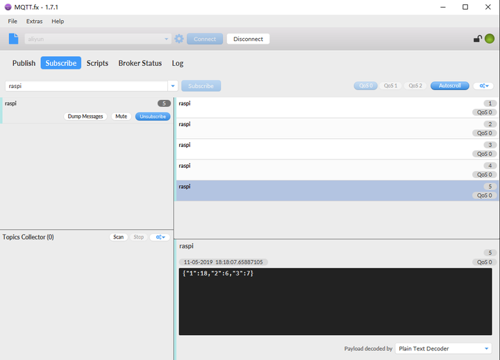 首先是PLC将数据发送到树莓派,修改监视表中的变量,当变量的数值发生变化时,会将消息发送至树莓派,树莓派将消息发送至MQTT服务器中,订阅消息的MQTT.fx客户端也会收到消息;