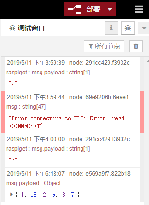 以上所有的节点均已经配置完毕,讲节点连接,并点击右上角的部署按钮,将Node-Red部署至树莓派中;