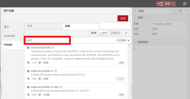 因为S7是西门子PLC专有的协议,因此树莓派中的Node-Red没有自带该节点,需自己安装(如果之前没有安装npm,安装新的节点便会很麻烦),如下图所示,打开Node-Red设置里的节点管理,搜索S7,安装第二个节点;