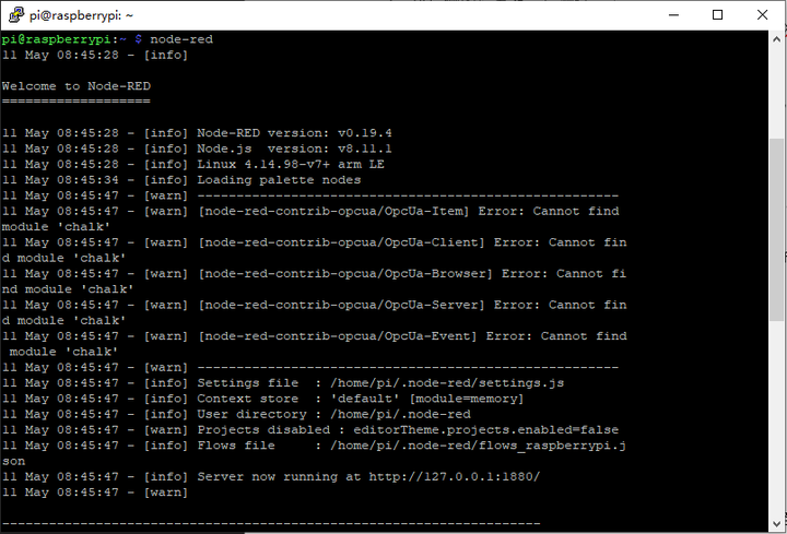 此时树莓派侧的前期准备工作基本完成,用putty连接树莓派后,运行Node-red;