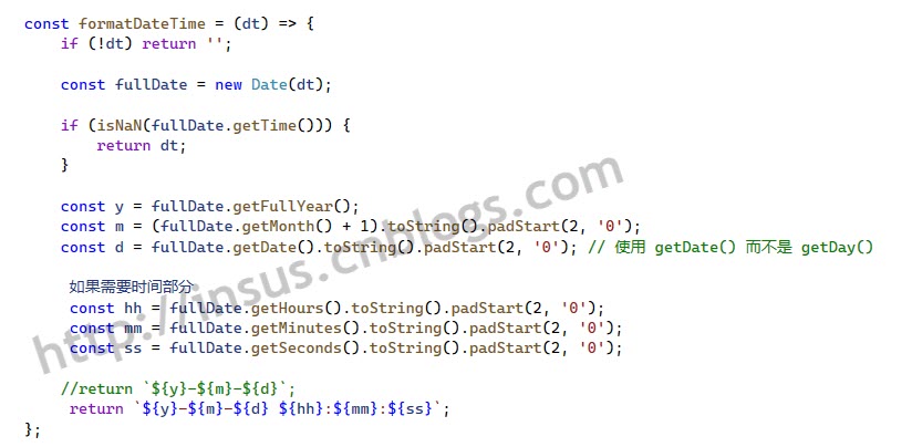 const y = fullDate.getFullYear(); //4位年份 const m = (fullDate.getMonth() + 1).toString().padStart(2, '0'); //月份,它是从0开始,需要加1。 const d = fullDate.getDate().toString().padStart(2, '0'); //日期,.padStart(2, '0')是保留2位数,不足时,前面补0 const hh = fullDate.getHours().toString().padStart(2, '0'); //时 const mm = fullDate.getMinutes().toString().padStart(2, '0'); //分 const ss = fullDate.getSeconds().toString().padStart(2, '0'); //秒