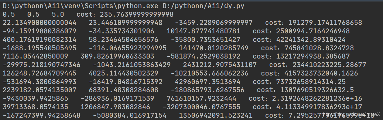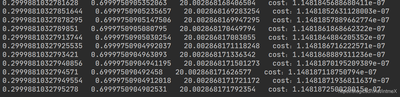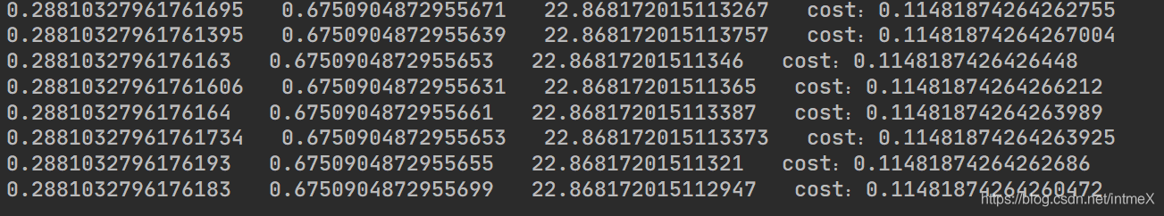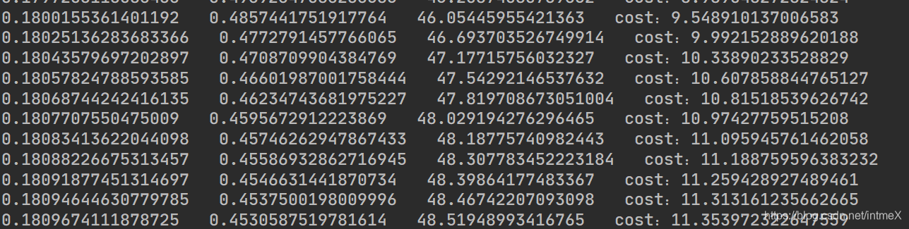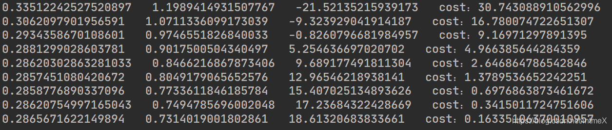 print(ww[0], " ", ww[1], " ", ww[2], " ", "cost:" + str(d)) # 每次输出w与b和方差