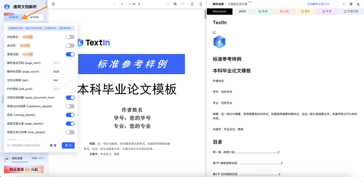 TextIn ParseX通用文档解析作为一款适配多样化场景的PDF解析工具,在基础识别能力以上,还提供了便捷、完善的参数配置功能,便于用户根据自身需求调整,获得所需输出结果。在TextIn技术社群,我们的产品团队也经常接到关于参数调配的提问与建议,因此,在本期指南中,我们将介绍常用参数的作用及使用方法,前端界面中参数面板的位置如下图所示。