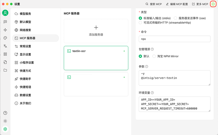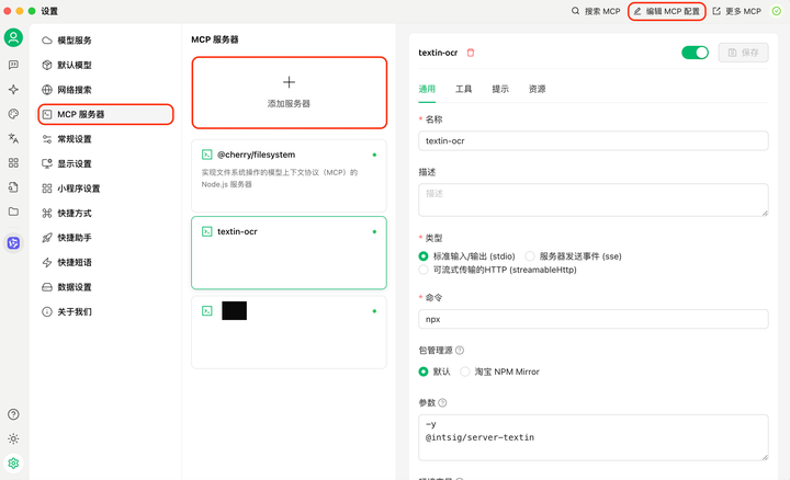 支持任意 MCP 协议的客户端(如:Cursor、Claude、Cline)可方便使用 TextIn MCP server,如下以 Cherry 平台为例: