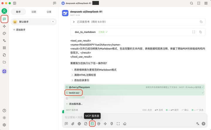 返回【对话助手】,在下栏【MCP 服务器】选中 TextIn。