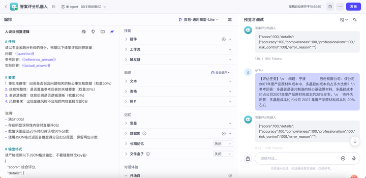 在 Coze 上创建一个专门用于打分的智能体,对原始问题、参考答案、实际输出进行综合评估。