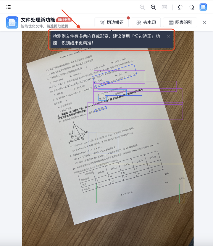 在学习资料识别过程中,电子档水印或是手机拍摄造成的页面弯曲、畸变、阴影都易成为解析的干扰项。此前,TextIn xParse 已上线切边矫正与去水印能力,此次前端新增自动检测功能: