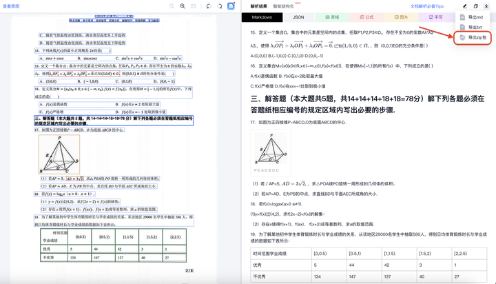 Markdown 输出结果中,图片一般以链接形式呈现。为了方便试卷、练习册等文件解析后的再整理,TextIn 前端新增功能,Markdown 中的图片链接可转成本地图片文件,直接通过压缩包形式下载保存。
