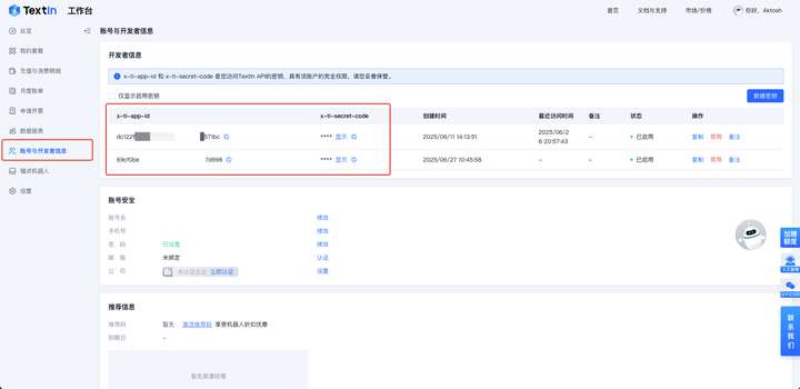 首先前往“账号与开发者信息”,获取 x-ti-app-id 和 x-ti-secret-code。