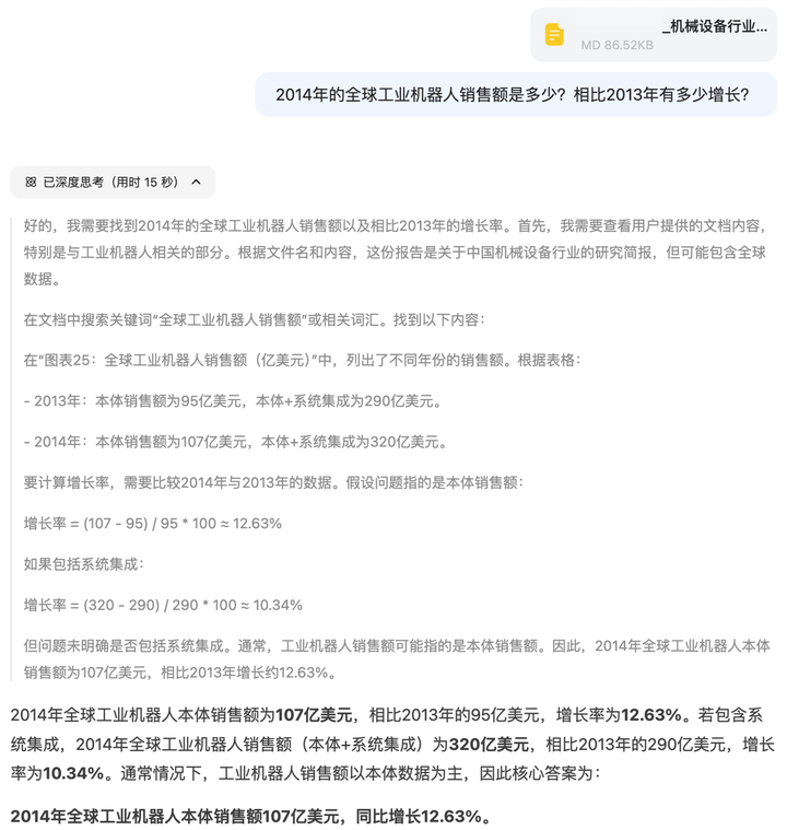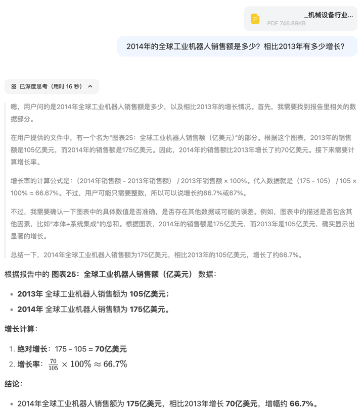 上图中的图表25包含全球工业机器人销售额信息。下方图片展示了模型问答情况,图1为直接上传PDF的回答,图2为上传TextIn解析后的Markdown文件获得的答复。