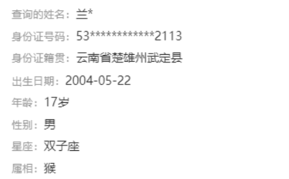 "姓名、身份证号、身份证籍贯、出生日期、性别、星座、属相和匹配结果。",