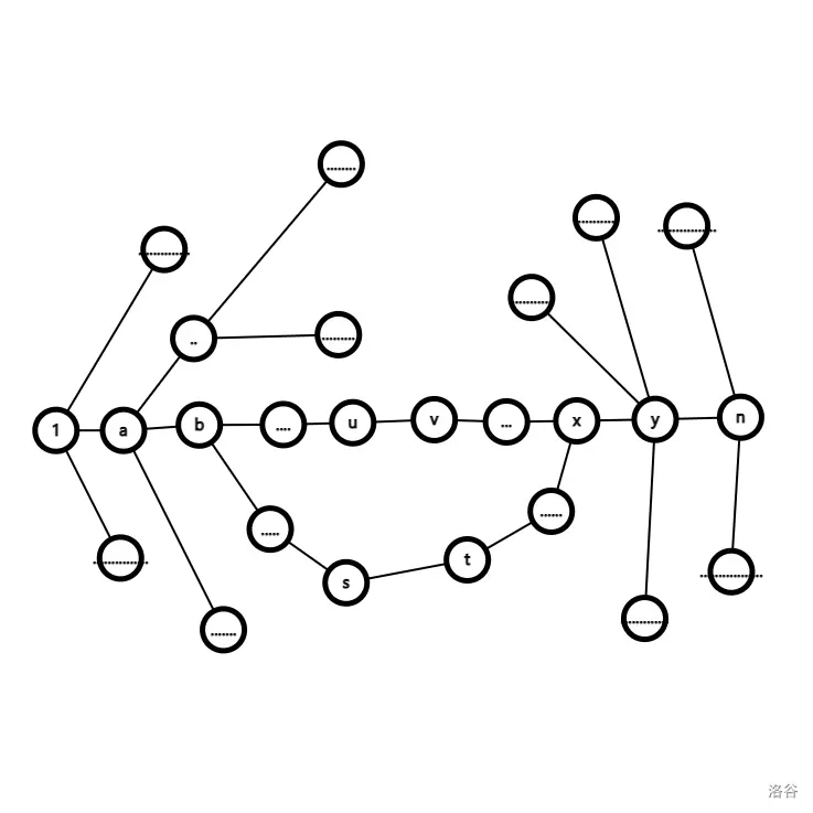 从图中看就是 \(1\to b\to s\to t\to x\to n\),而且要满足 \(b\) 在 \(u\) 前面, \(x\) 在 \(v\) 后面。