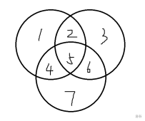 第一,二,三个圆分别表示 \(a,b,m\),中间的区域 \(2,5\) 就是 \(a\ \text{and}\ b\),\(4,5\) 就是 \(a\ \text{and}\ m\),\(5,6\) 就是 \(b\ \text{and}\ m\),\(5\) 就是 \(a\ \text{and}\ b\ \text{and}\ m\)。