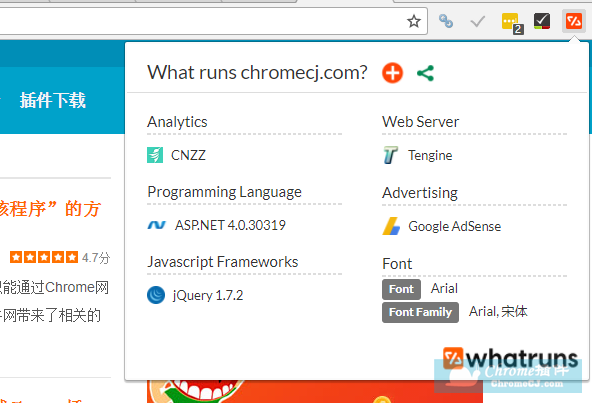 在chrome浏览器中安装了这款插件后,我们就可以通过点击WhatRuns图标来打开插件窗口,通过该窗口使用者可以轻松了解网站的技术信息,让你不用自己慢慢挖掘分析网站源码,点一下按钮就会立即显示出来。