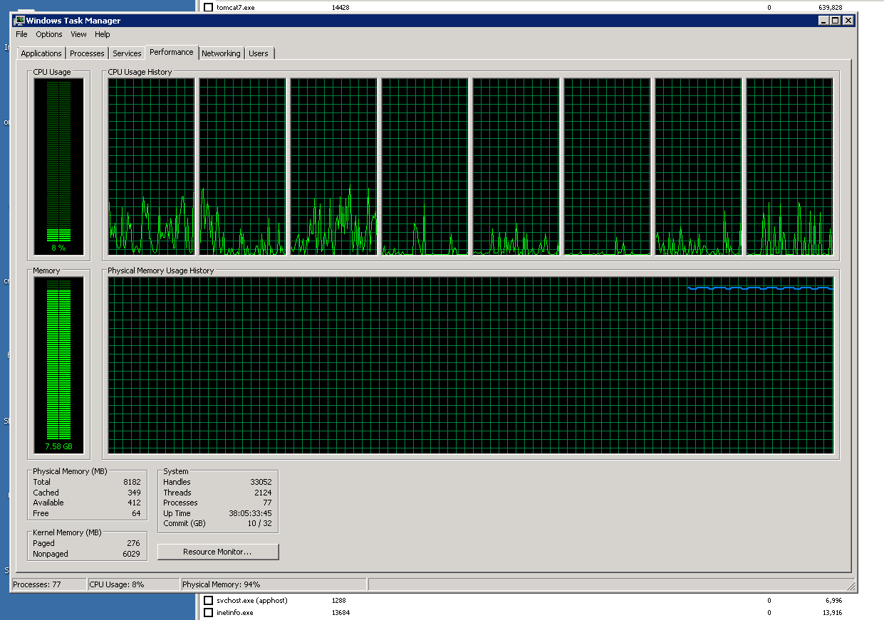 So I'd advise you to try Mark's query and use a better tool for memory report. Or just trust Perfmon to report memory, not Task Manager.