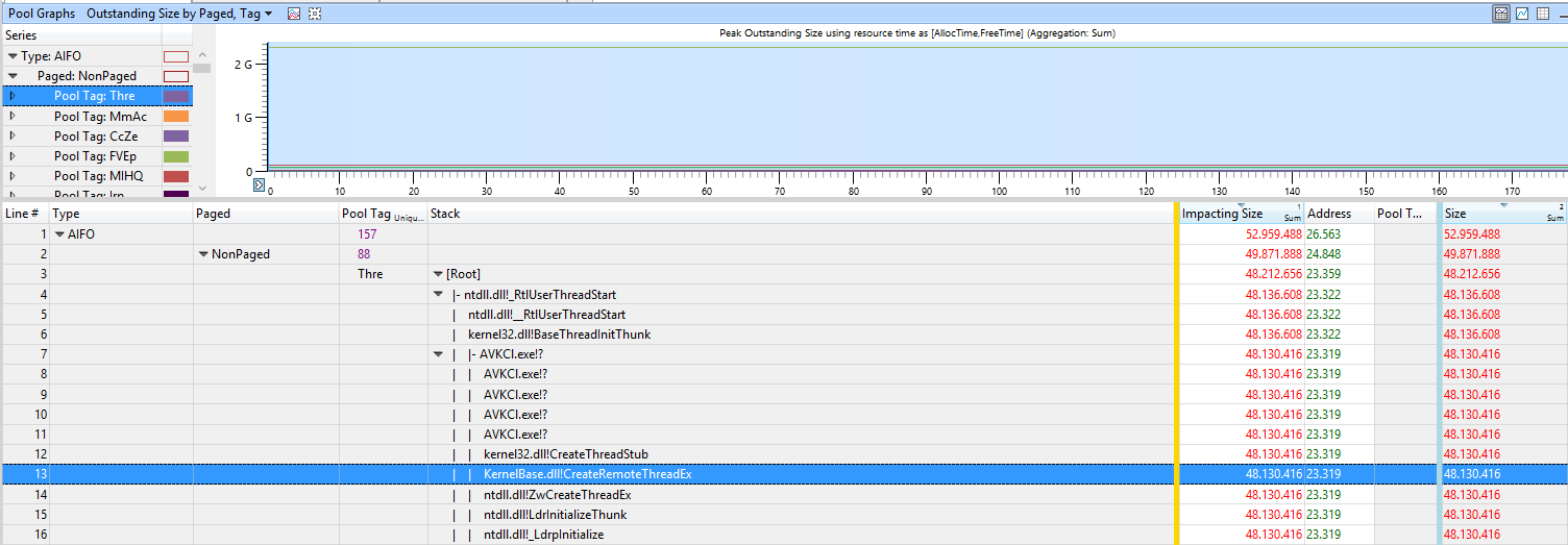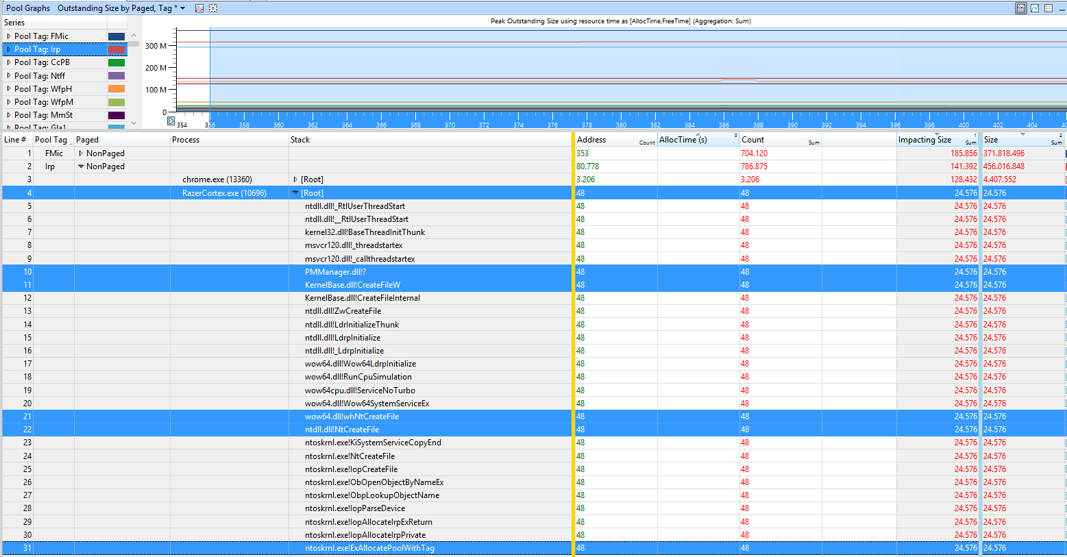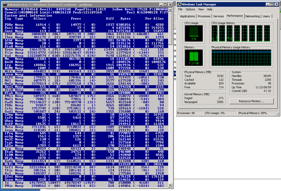 xperf -on PROC_THREAD+LOADER+POOL -stackwalk PoolAlloc+PoolFree+PoolAllocSession+PoolFreeSession -BufferSize 2048 -MaxFile 1024 -FileMode Circular && timeout -1 && xperf -d C:\pool.etl