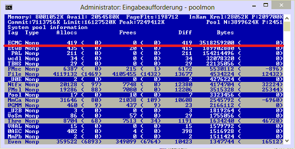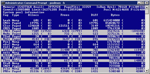 Now open a cmd prompt and run the findstr command. To do this, open cmd prompt and type cd C:\Windows\System32\drivers. Then type findstr /s __ *.*, where __ is the tag (left-most name in poolmon). Do this to see which driver uses this tag:
