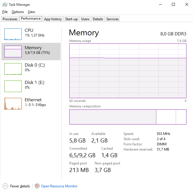 A few days ago I updated my PC to Windows 10. However, after some use my PC started to slow down until it was impossible to use – it was due to high memory usage. After a restart, everything came back to normal (total usage around 25% of 8GB of RAM). However, during a few hours of usage the memory builds up again to 70%, and if not restarted it further goes to 100%, and later on even freezes. Task manager does not help very much as it does not show all the processes (added screenshots below). Also tried RAMMap but it gives an error: "error refreshing database". I tried Googling this question, yet without much success.