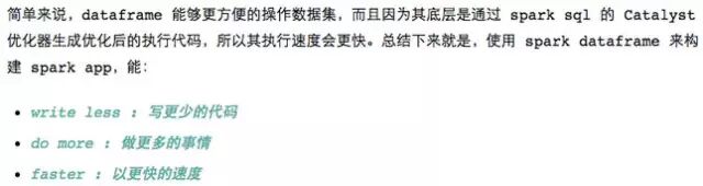 还记得我们的第七篇 Spark 博文里吗?里面我用三点来总结 spark dataframe 的好处: