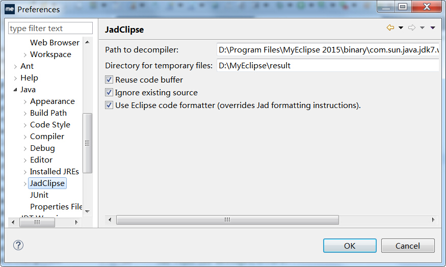 3、启动MyEclipse ,Window->Preferences->Java->JadClipse