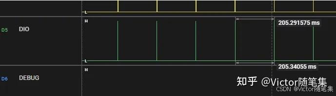 通过逻辑分析仪抓取中断引脚DIO上的波形,如下图,是每隔205ms产生一次timeout中断的。