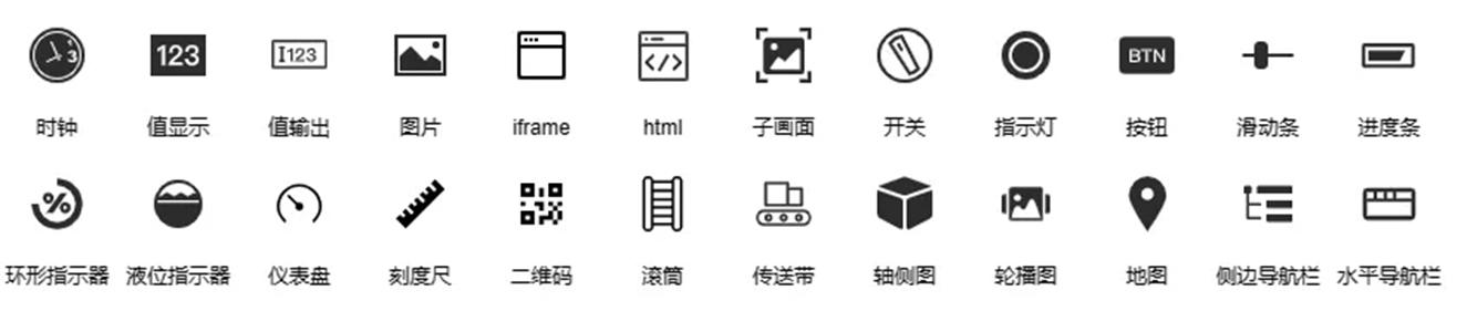 内置组件库,包括数显框、时钟、仪表盘、指⽰灯、开关、按钮、进度指示器、表单组件、交互组件等。