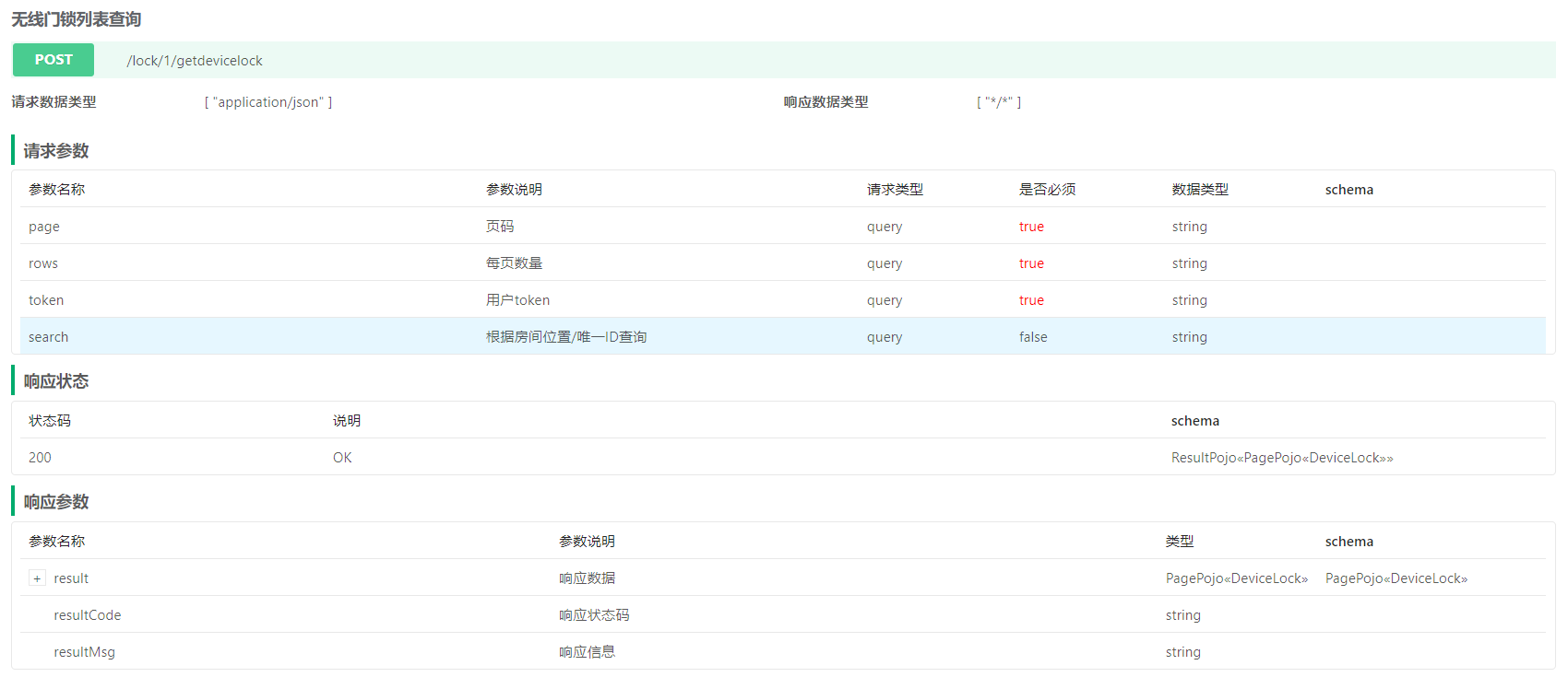 #无线门锁列表查询 ->传入页码、每页数量、用户token和房间位置或者唯一ID(非必要) ->返回响应信息