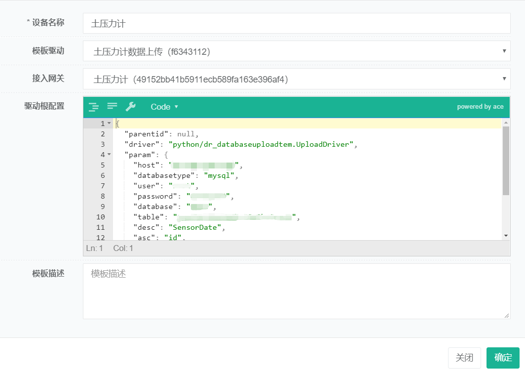 填写设备名称 -> 填写驱动信息 -> 填写配置(数据库主机IP、登陆用户名、登陆密码、数据库名称、数据库类型、查询表名、倒序排序【可为空】、顺序排序【可为空】、前TOP行数据) -> 确定。