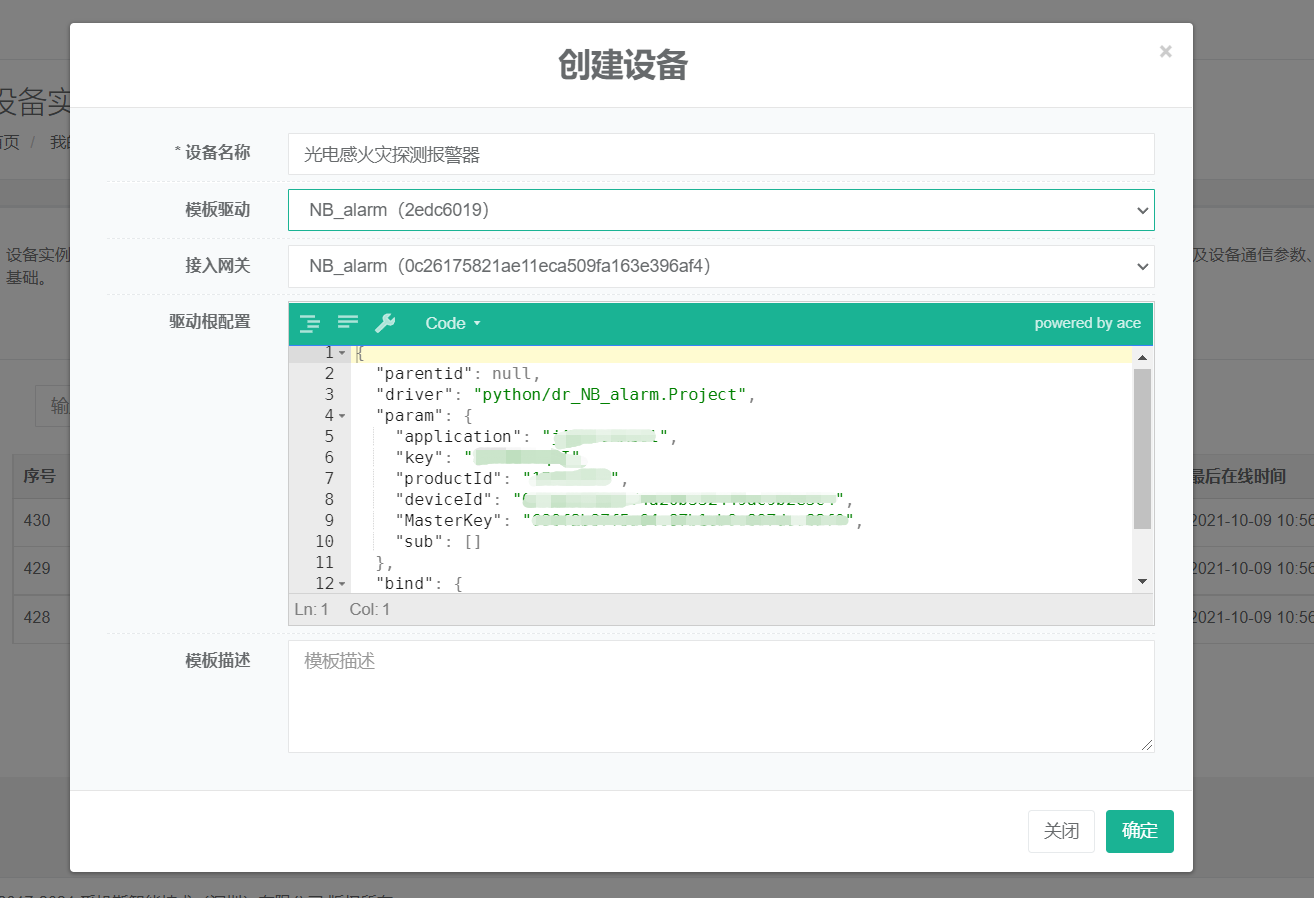 - 填写【设备名称】、选择刚刚创建的【模板驱动】和【通信网关】。