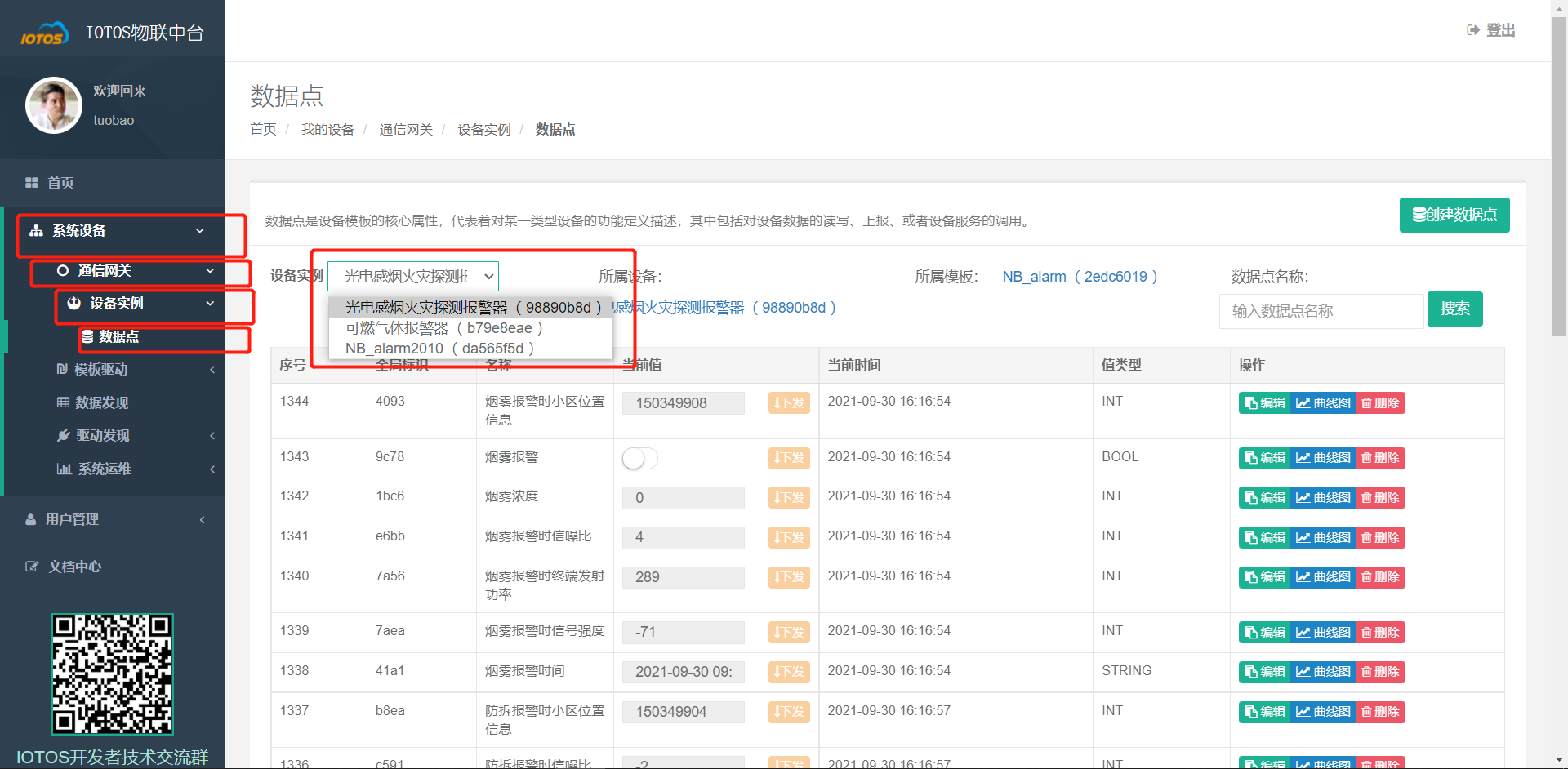 - 点击 【系统设备】 -> 【通信网关】 -> 【设备实例】->【数据点】,选择刚才创建的设备实例