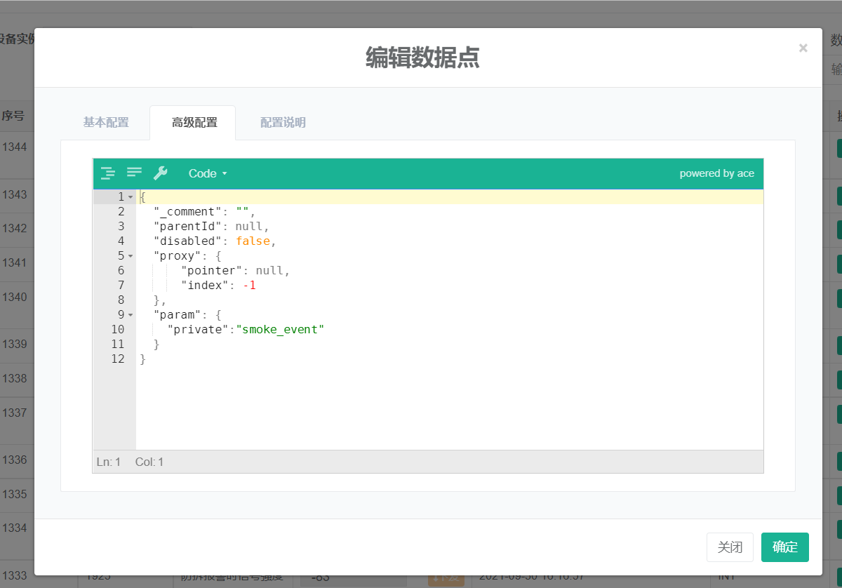 - 并在高级配置中配置数据点的相关标志,“烟雾报警时小区位置信息”,“防拆报警时小区位置信息”,“电池电量”这三个为接收数据的三种数据类型的第一个点,配置"private"属性用于驱动识别,分别配置为smoke_event,tamper_event,show_data,例如“烟雾报警时小区位置信息”这个点的配置: