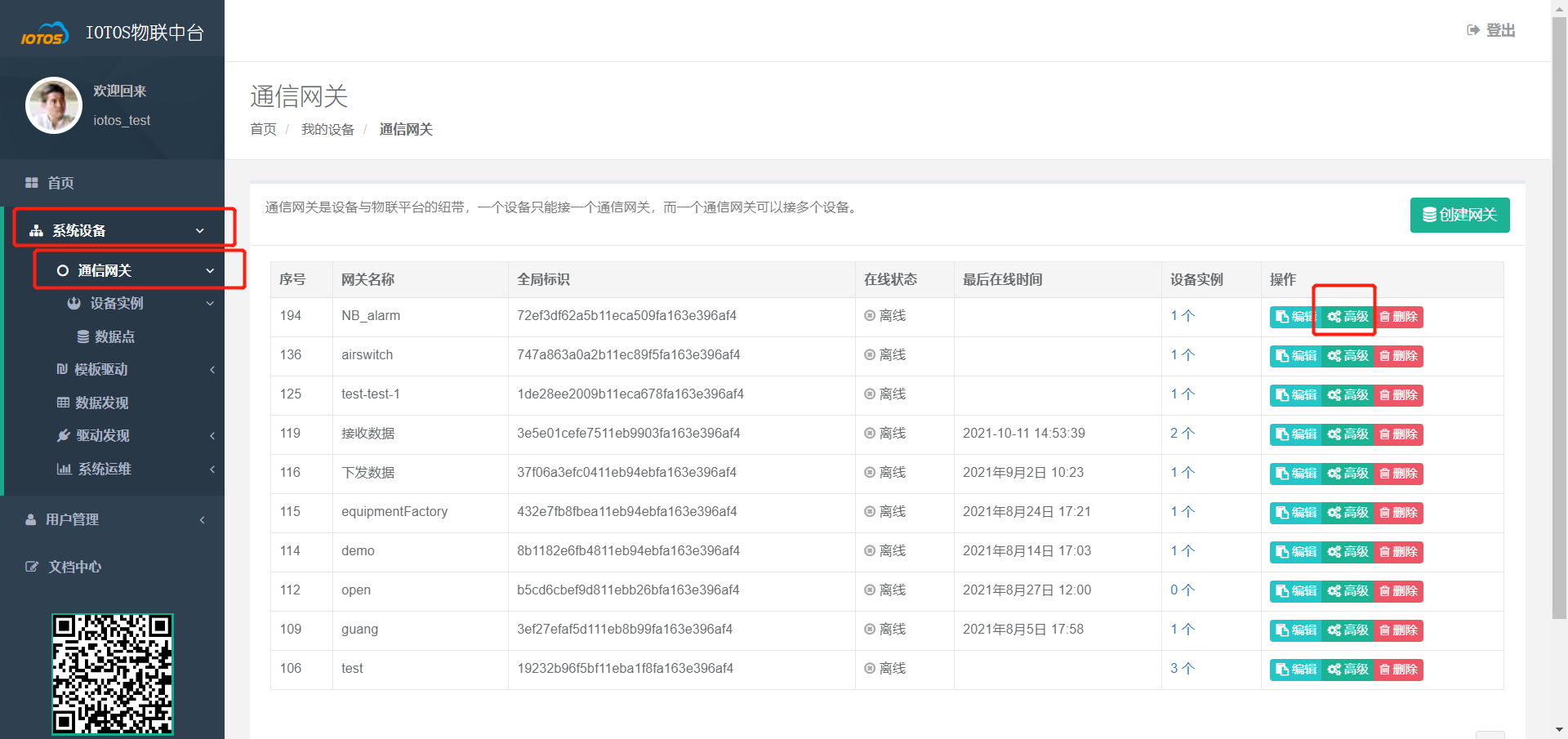 - 在【系统设备】 -> 【通信网关】中找到刚才创建的网关,点击【高级】