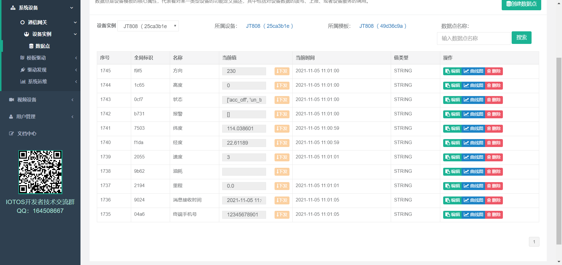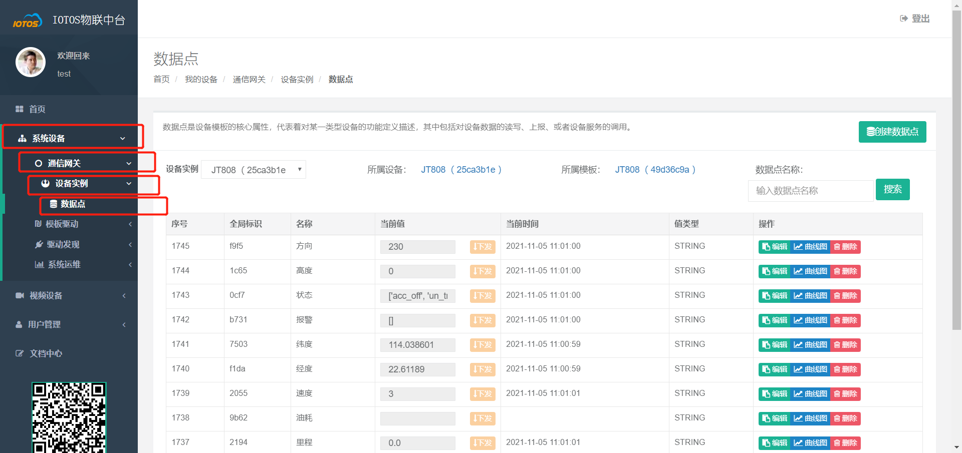 - 点击 【系统设备】 -> 【通信网关】 -> 【设备实例】->【数据点】,选择刚才创建的设备实例