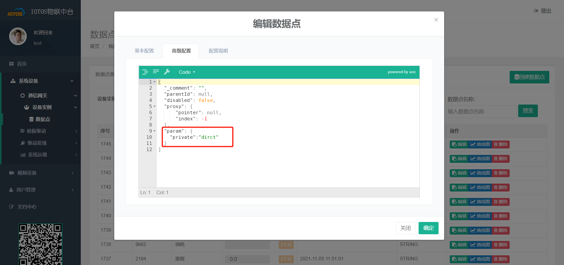 - 并在高级配置中配置数据点的相关标志,需要拿多少数据就可以配置多少数据,目前测试的数据:方向、高度、状态、报警、纬度、经度、速度、油耗、里程、消息接收时间、终端手机号(名称可以修改),又要要可以增加,需要在数据点里面的param中配置相应的"private"属性: ,例如: