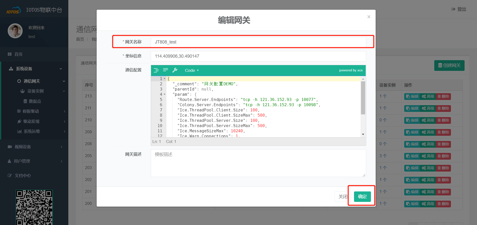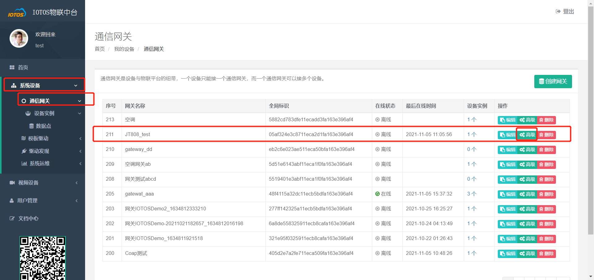- 在【系统设备】 -> 【通信网关】中找到刚才创建的网关,点击【高级】