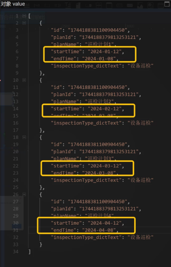 输入对象数组,其中对象元素有固定的startTime和endTime两个字段,现在要把这两个字段的时间,合成一个字符串,中间用‘~’隔开,形成新的字符串数组输出。