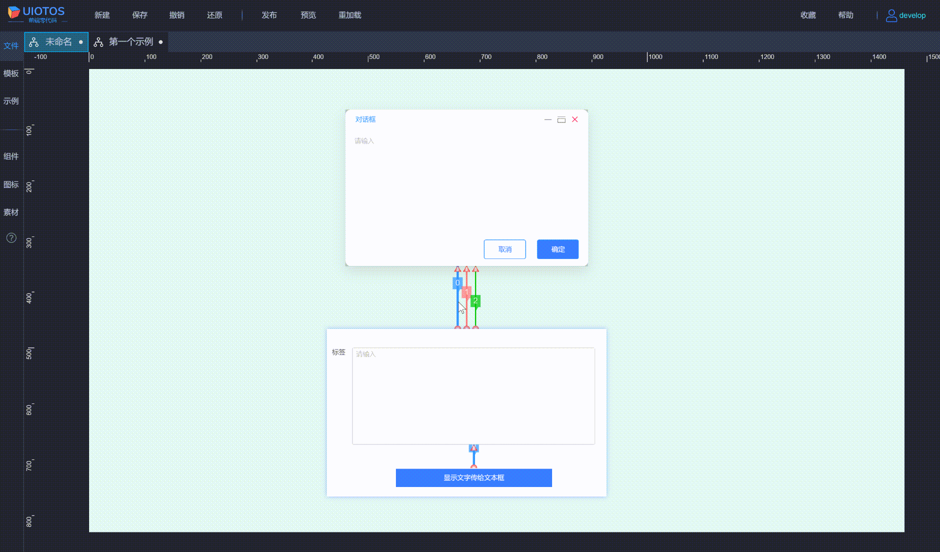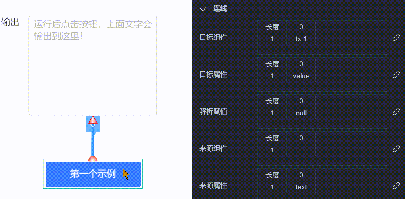 连线传递属性值的分为被动和主动两种方式,当前介绍的为被动,即连线操作依赖于来源组件的事件触发。