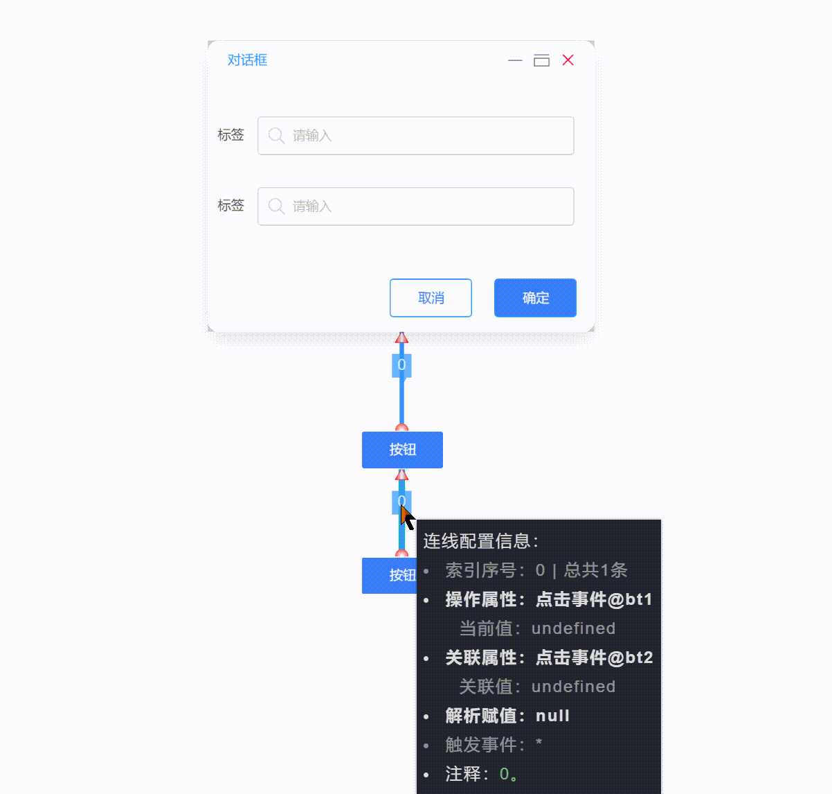 如下所示,上面按钮直接连线可触发弹窗,下面按钮连线操作上面按钮,关联自身点击事件时,也能间接触发弹窗。