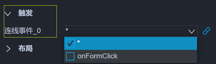 默认情况下,来源组件所有事件都会触发连线执行,可选择指定事件触发。比如