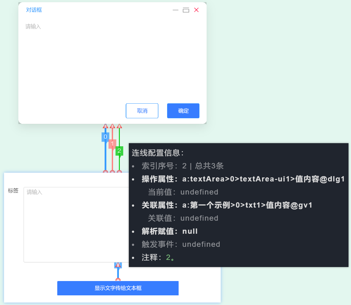 文本框传值给对话框,且触发对话框弹窗。第一条连线,由文本框的值内容指向对话框的内容;第二条连线由文本框的回车时事件,指向对话框的弹窗属性。其中