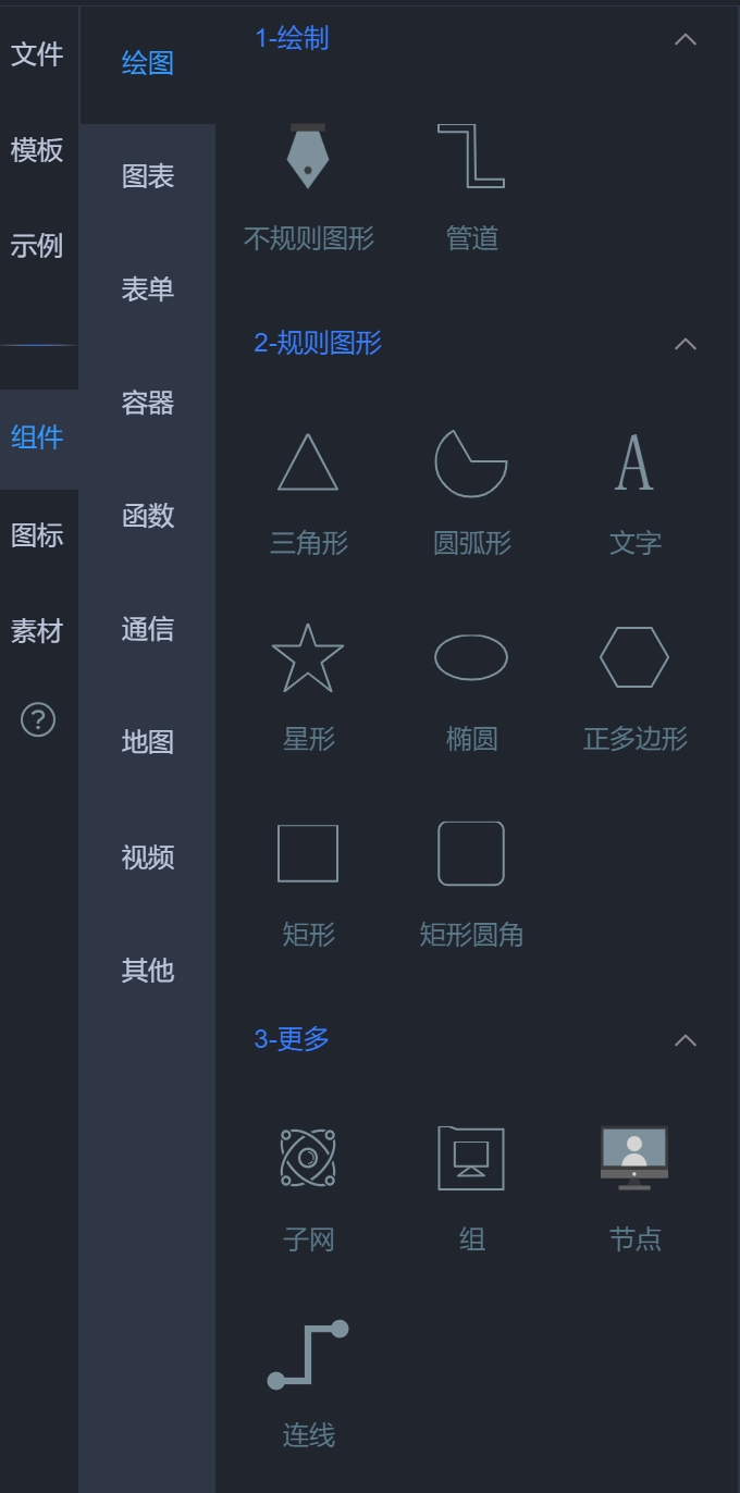 组件栏中有绘图、图表、表单、容器、函数、通信、视频等类型。