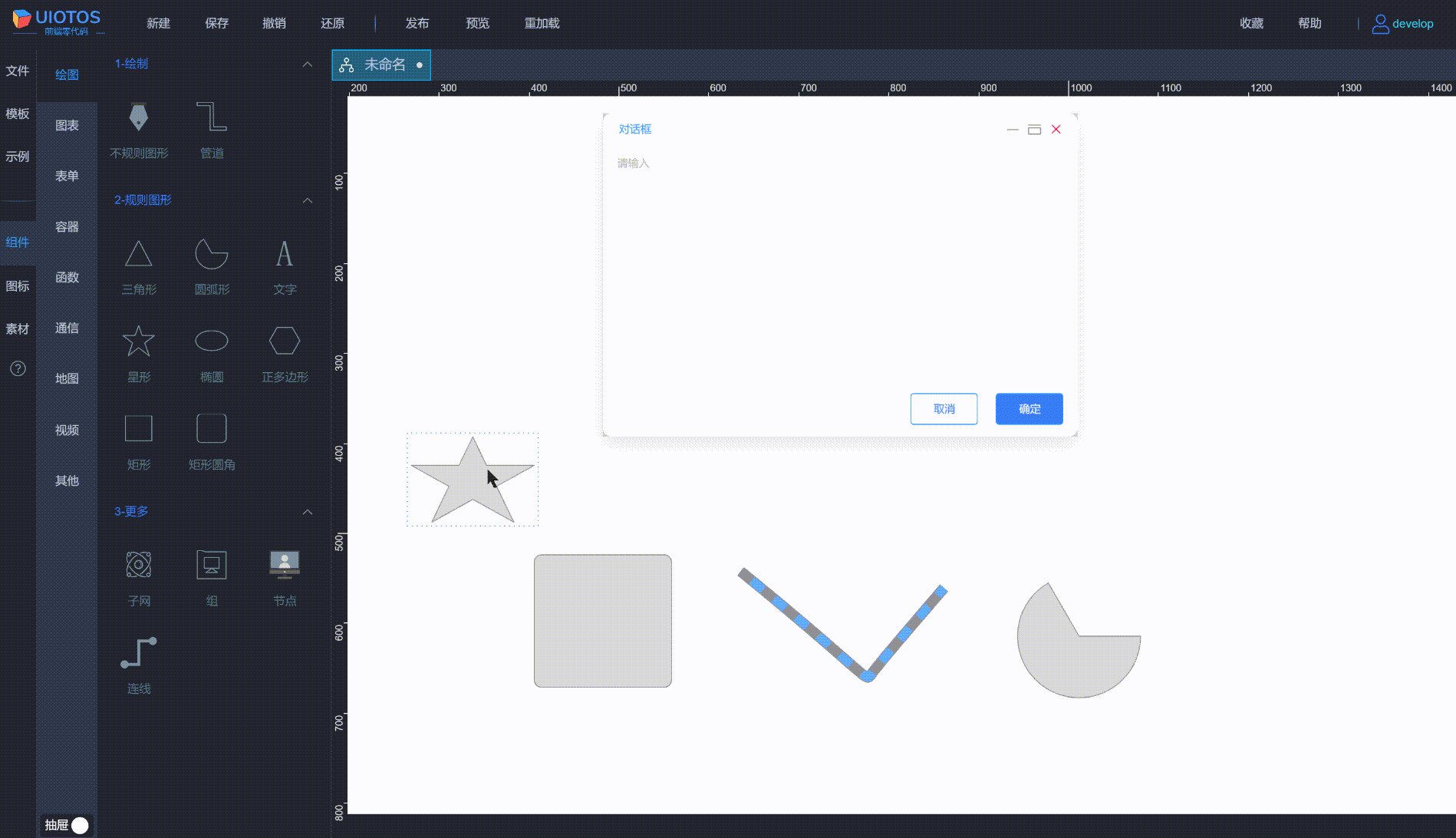 这是按功能划分。若按照性质划分,UIOTOS中的组件又可以分为界面、功能、容器三大类。前面介绍过连线,现在分别对这三类结合连线展开说明。